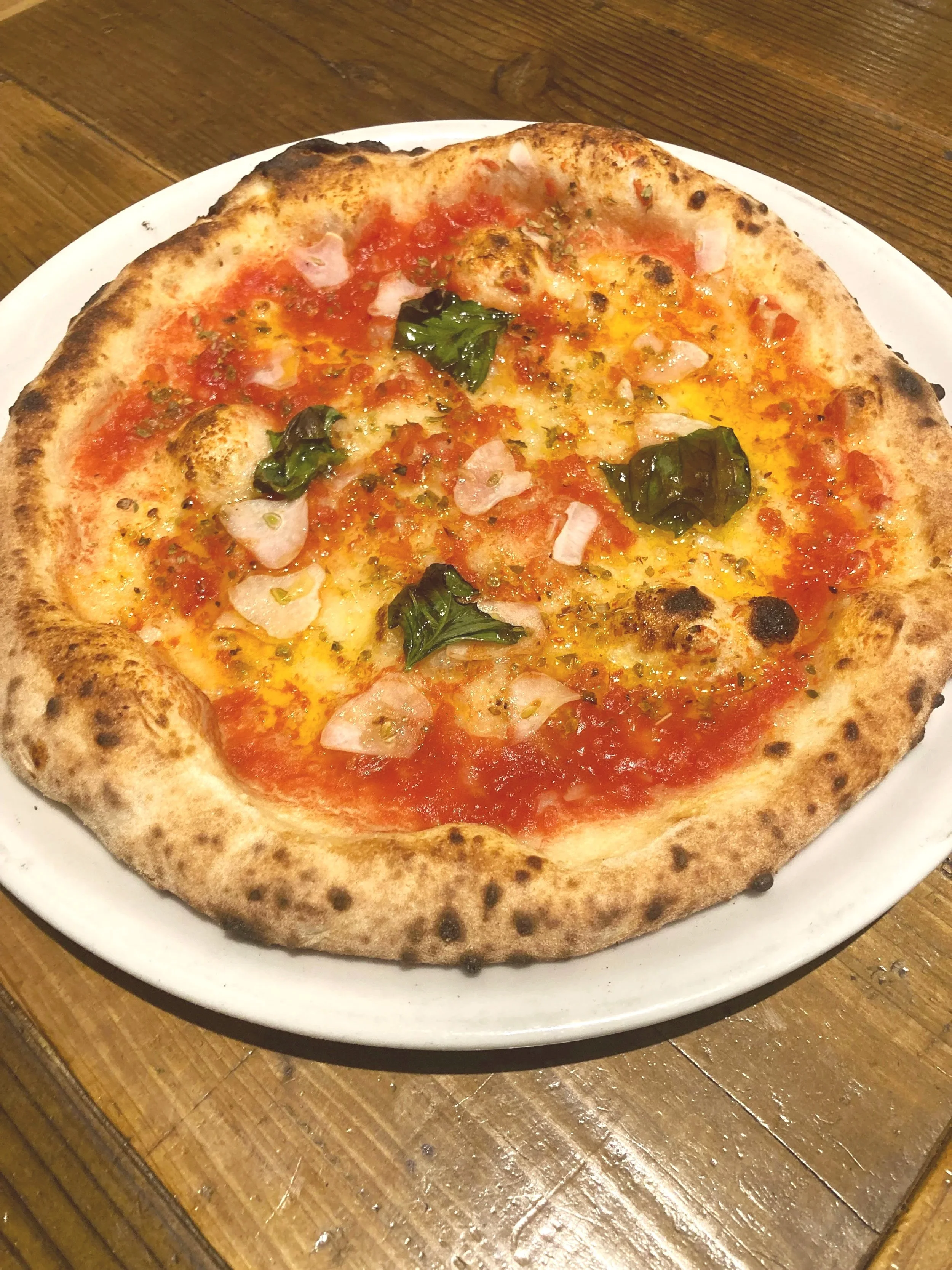 にんにくとトマトソース、オレガノの香りが広がる、チーズ不使用のシンプルピザ。素材の旨みをダイレクトに味わえる一枚。1200 yen