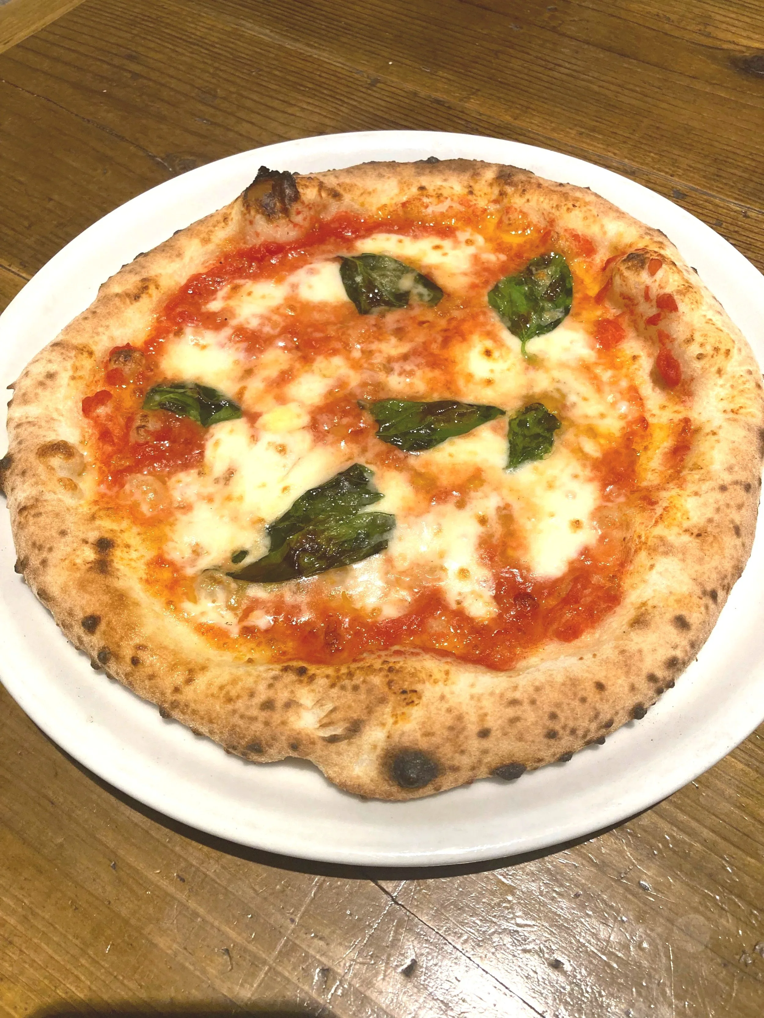 トマト・モッツァレラ・バジルだけで仕上げた王道の一枚。シンプルだからこそ素材の美味しさが際立つ、定番マルゲリータ。1380 yen